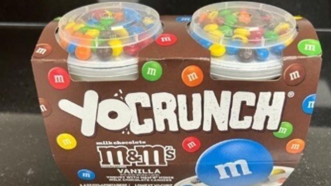 The YoCrunch is recognizable by the distinctive dome-shaped lids on top of the package, containing small treats like candy that can be mixed into the yogurt.