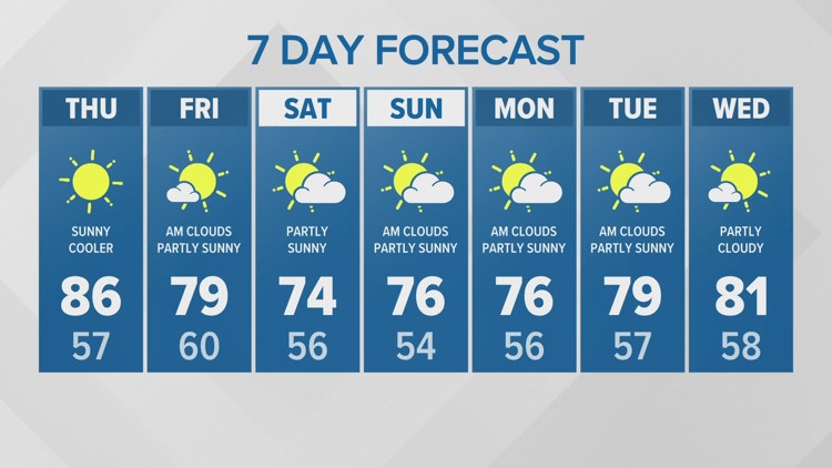 Mostly sunny. Highs in the upper 70s and lows in the upper 50s.